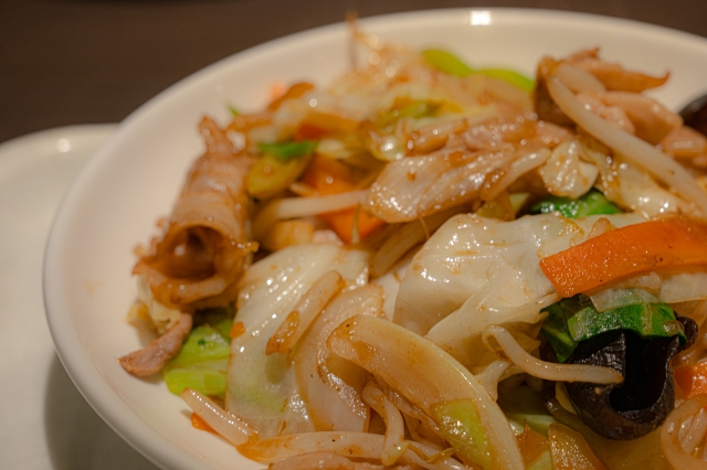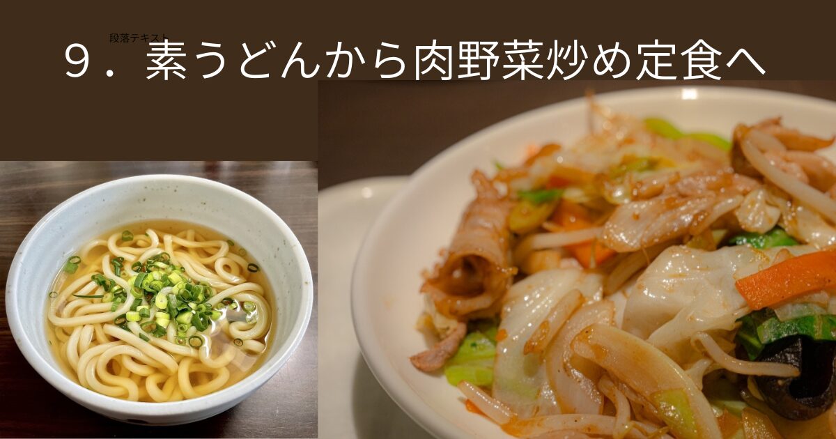素うどんから肉野菜炒めへ。