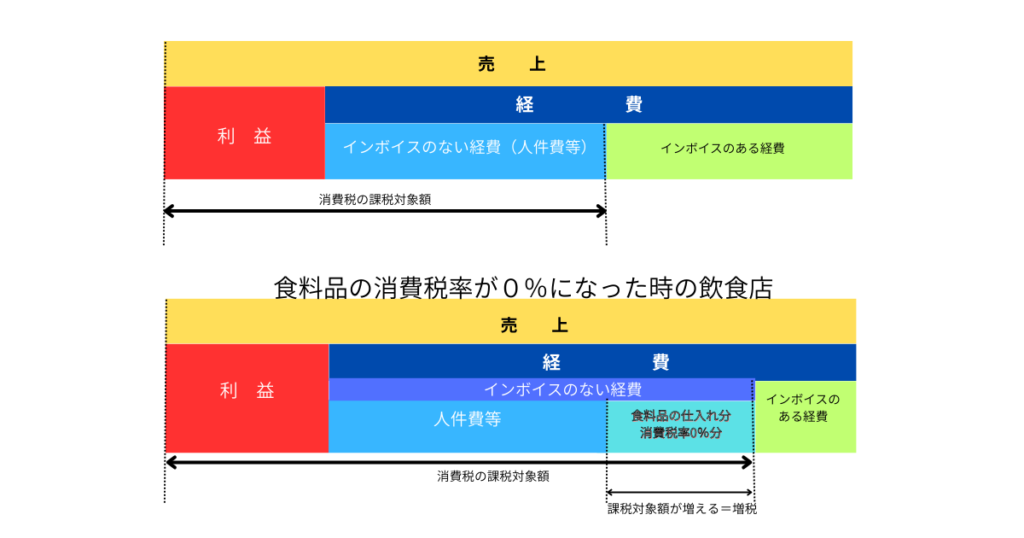 この話のついでに、いま食料品の消費税率を1年間とか、2年間とか0%にするといっている政党がありますね。これ、飲食店にとっては死活問題になります。なぜなら、増税になる可能性が非常に高いからです。