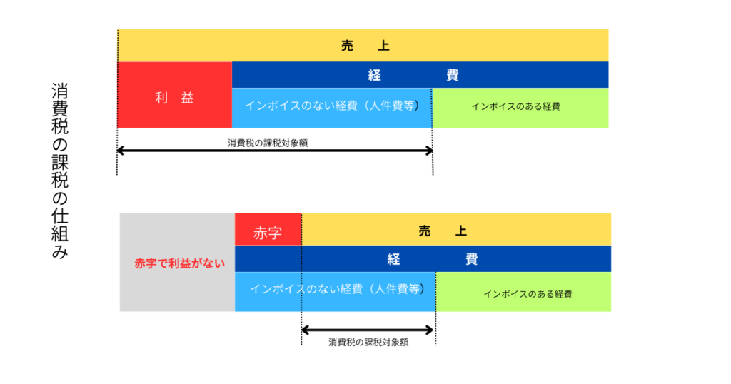 赤字であろうと、総売り上げからインボイスのある経費を除いて残った金額に課税される。